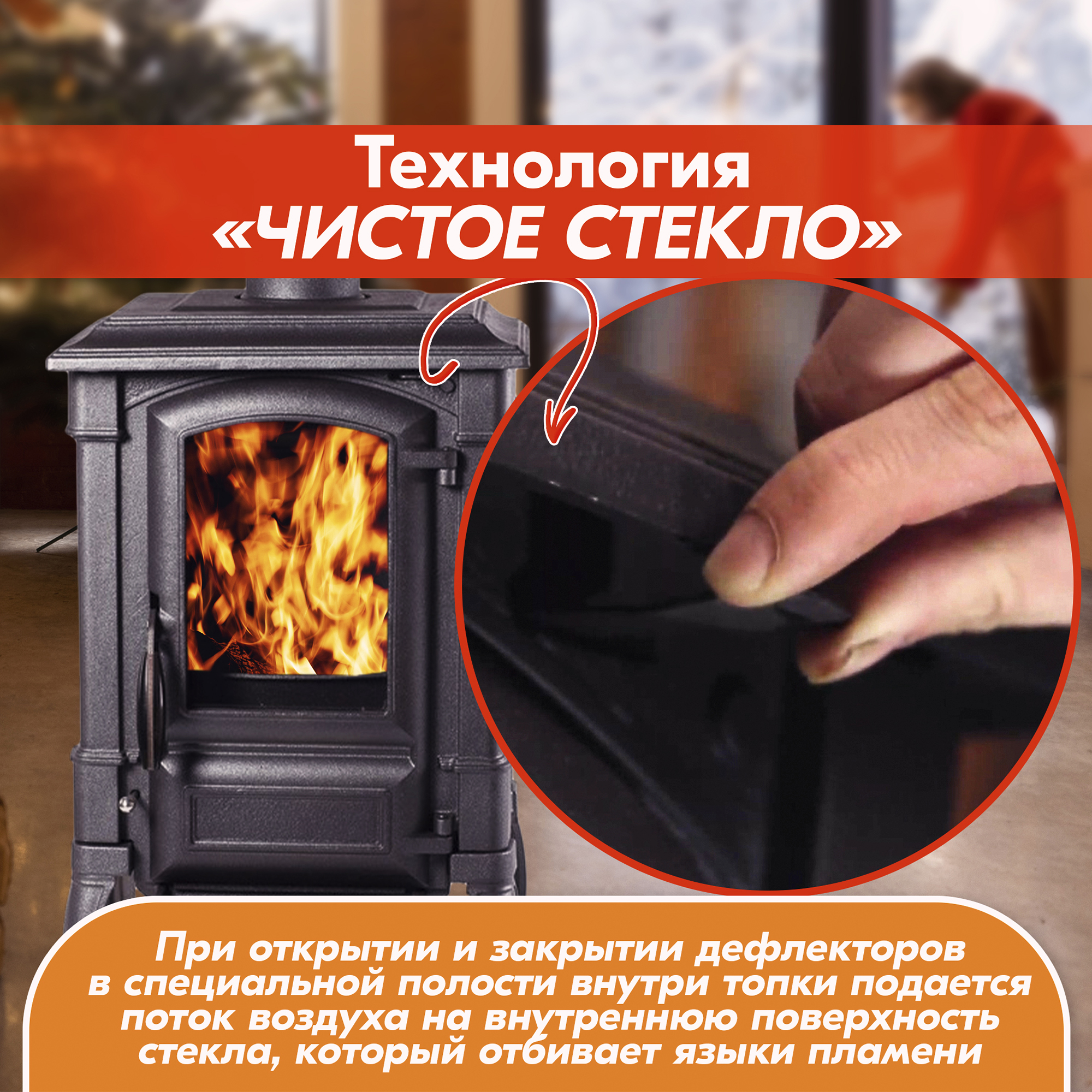 В конструкцию чугунной печи-камина внедрена система дожига вторичных (пиролизных) газов, позволяющая увеличить КПД камина до 82% и скорость нагрева отапливаемого помещения.