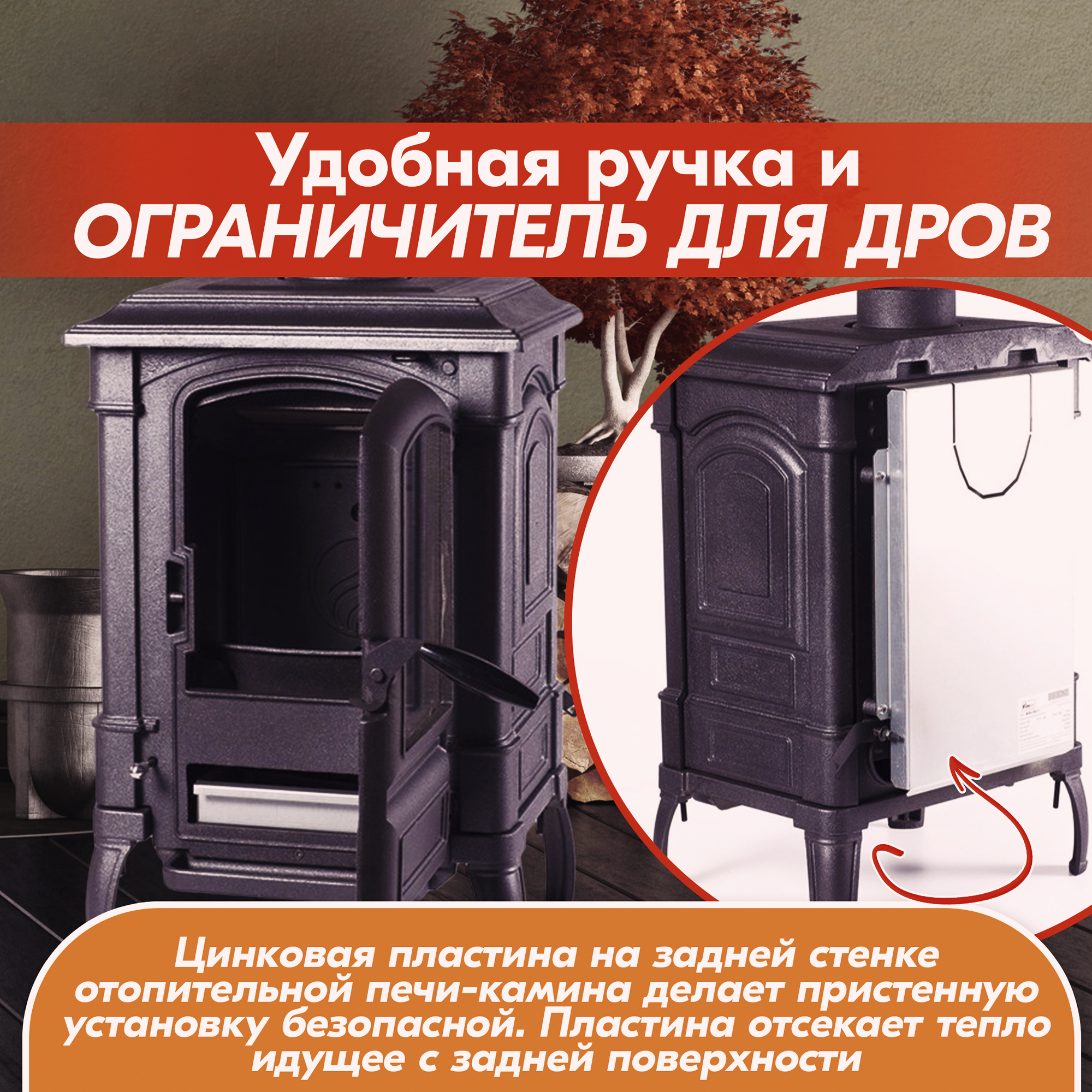 Благодаря конструктивным особенностям чугунной печи-камина достигается высокий уровень теплоотдачи при небольшом расходе дров.