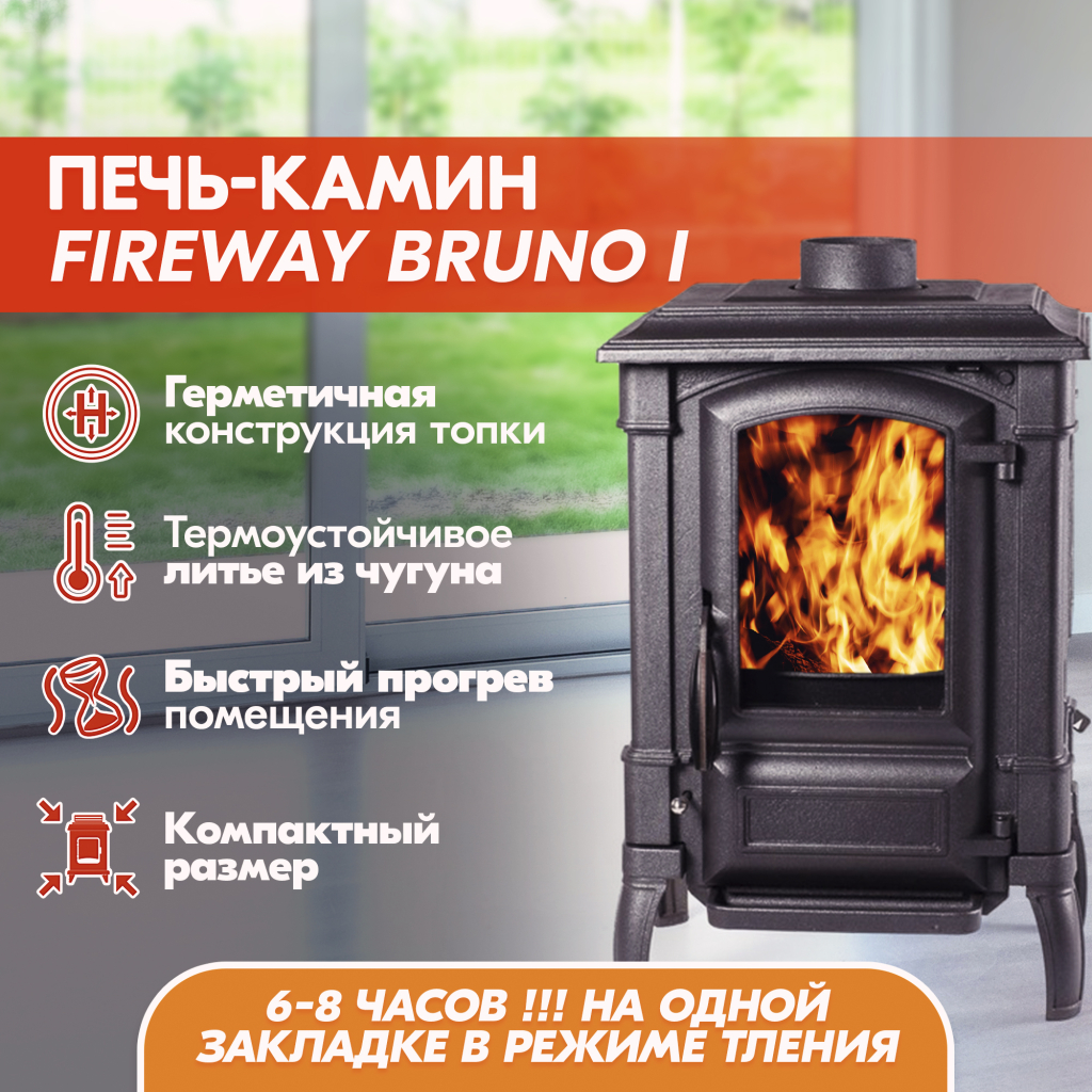 Печь-камин FireWay (ФаирВэй) Bruno I (Бруно 1) чугунная – это компактный и в то же время достаточно мощный и простой в эксплуатации отопительный камин от российского бренда «FireWay».