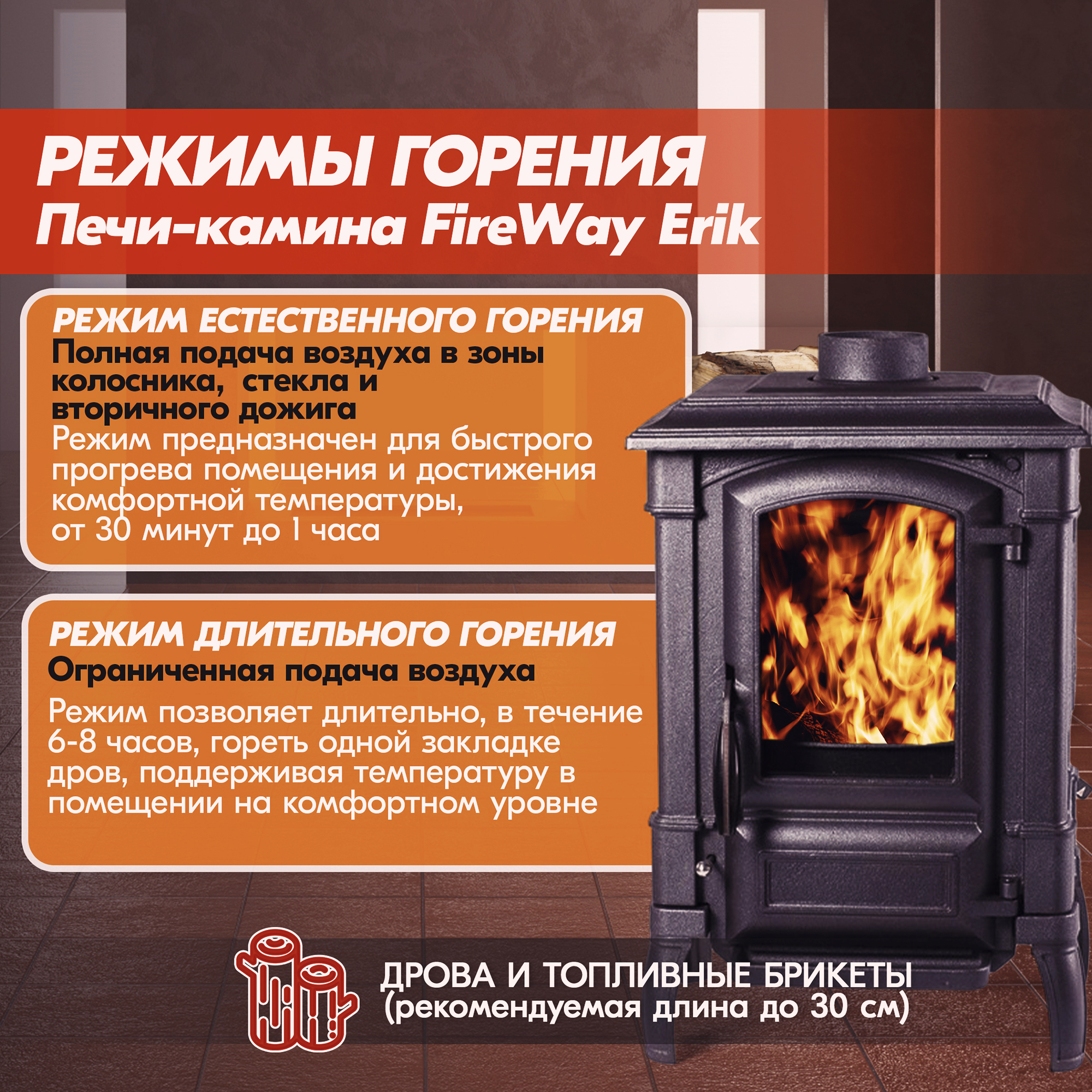 После достижения в помещении комфортной температуры рекомендуем переводить печь-камин в режим длительного горения, регулируя и уменьшая подачу воздуха.