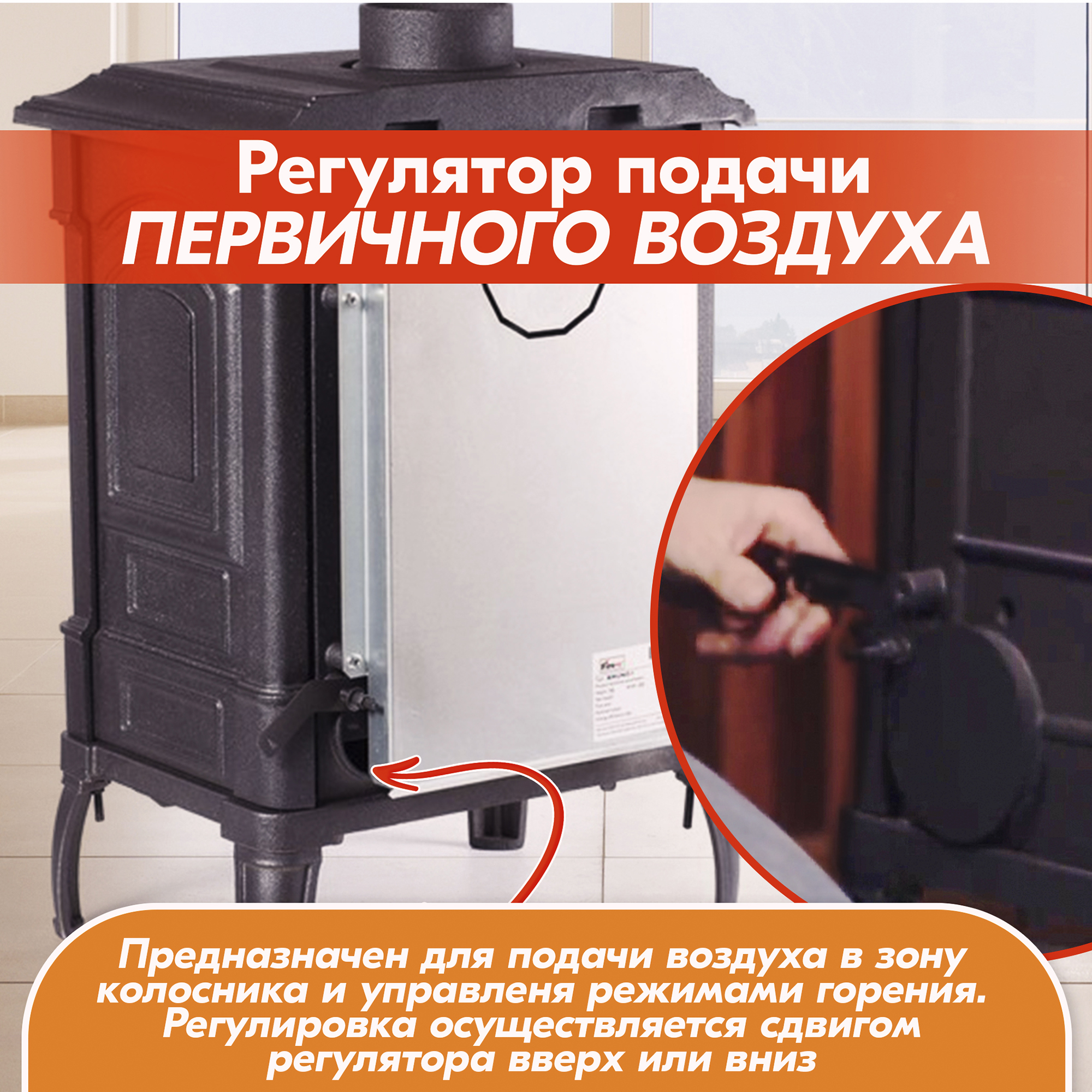 При дальнейшей работе чугунной печи-камина, при достижении стабильного режима горения, первичный регулятор можно прикрыть или закрыть полностью для экономии топлива и перевода камина в режим длительного горения или тления.