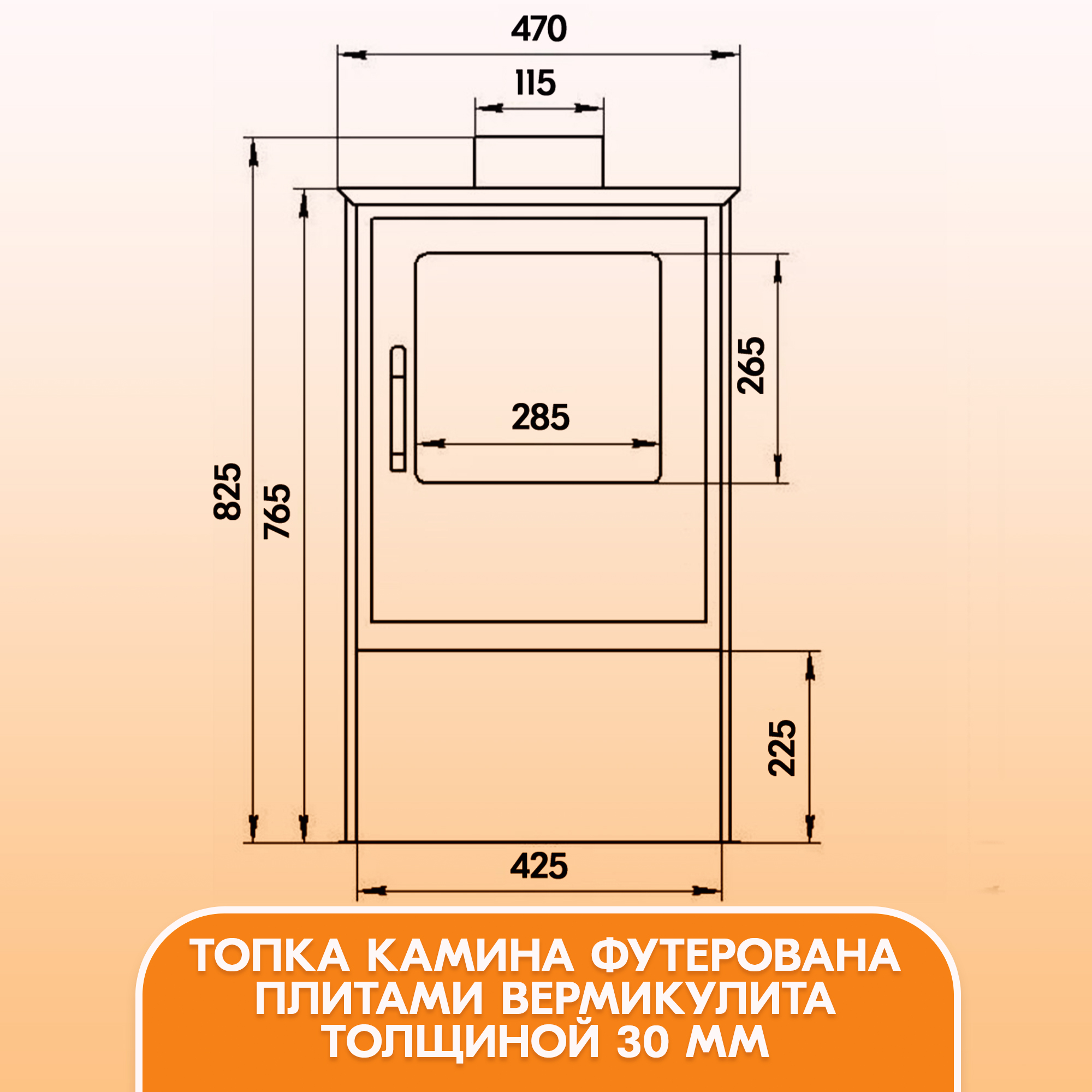 Конструкция печи-камина оснащена дверцей со вставкой из специального жаростойкого стекла, большое стекло позволяет наблюдать за янтарными переливами пламени.